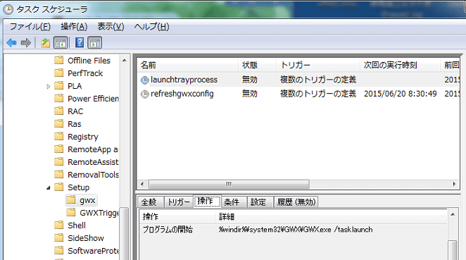 タスクは”\Microsoft\Windows\Setup\gwx\refreshgwxconfig”と”\Microsoft\Windows\Setup\gwx\launchtrayprocess”になります。