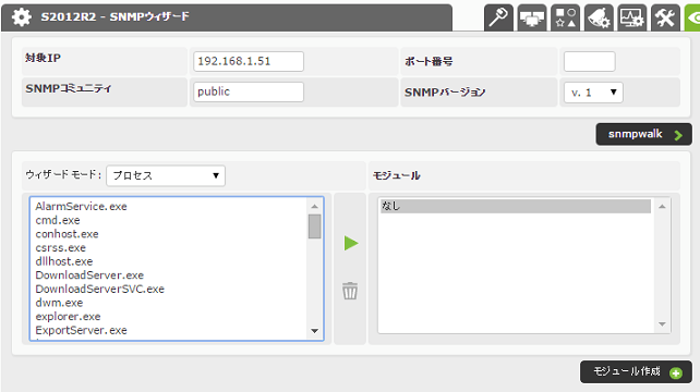 エージェントウィザードから「SNMPウィザード」或いは「SNMPインターフェイスウィザード」を選択して監視対象にするMIB項目を選択します。
