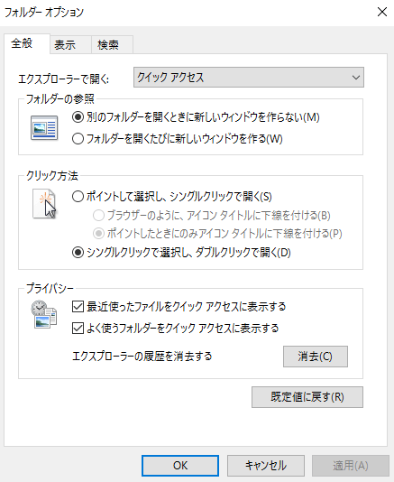 [プライバシー]の[□最近使ったファイルをクイックアクセスに表示する][□よく使うフォルダーをクイックアクセスに表示する]のチェックをOFFにします。
