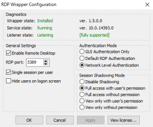 RDP Wrapper Library v1.6 Installer v2.3 Copyright (C) Stas'M Corp. 2016 [*] Notice to user: - By using all or any portion of this software, you are agreeing to be bound by all the terms and conditions of the license agreement. - To read the license agreement, run the installer with -l parameter. - If you do not agree to any terms of the license agreement, do not use the software. [*] Installing... [*] Terminal Services version: 10.0.14393.0 [+] This version of Terminal Services is fully supported. [*] Configuring TermService... [*] Starting TermService... [+] TermService found (pid 1060). [*] Shared services found: CryptSvc, Dnscache, LanmanWorkstation, NlaSvc [*] Extracting files... [+] Folder created: C:\Program Files\RDP Wrapper\ [*] Downloading latest INI file... [+] Latest INI file -> C:\Program Files\RDP Wrapper\rdpwrap.ini [+] Extracted rdpw64 -> C:\Program Files\RDP Wrapper\rdpwrap.dll [*] Configuring service library... [*] Checking dependencies... [*] Checking CertPropSvc... [*] Checking SessionEnv... [*] Terminating service... [*] Starting CryptSvc... [*] Starting Dnscache... [-] StartService error (code 1056). [*] Starting LanmanWorkstation... [*] Starting NlaSvc... [-] StartService error (code 1056). [*] Starting TermService... [*] Configuring registry... [*] Configuring firewall... OK [+] Successfully installed. ______________________________________________________________ You can check RDP functionality with RDPCheck program. Also you can configure advanced settings with RDPConf program. 続行するには何かキーを押してください . . . |