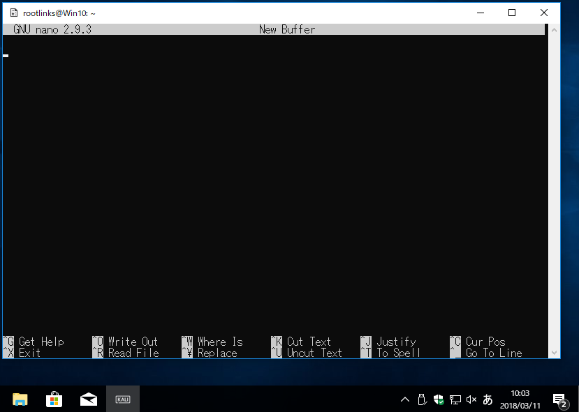 Kali Linuxにはnanoエディタがインストールされていたので、取り敢えずこれを使ってみます。