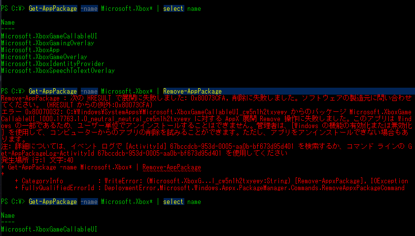 設定やスタートメニューからアンインストールできるものは削除したのですが、xboxはできなかったのでpowershellで削除しました。